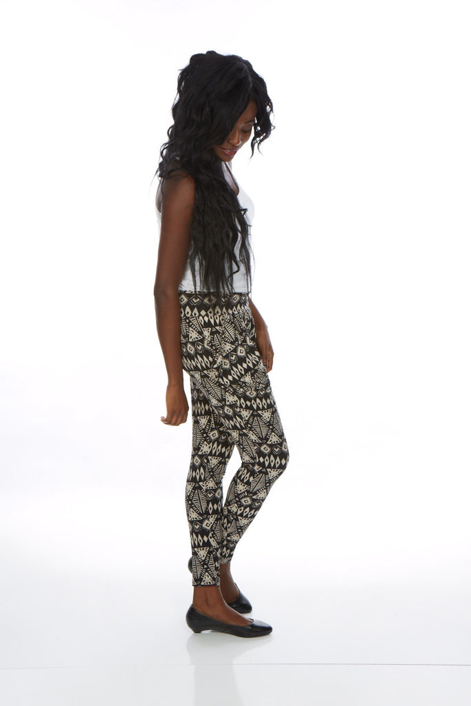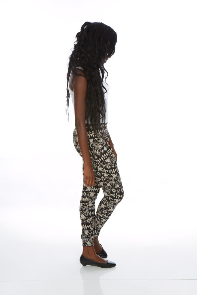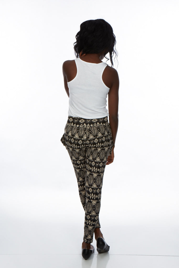 Tribal harem print woven pants with drape pockets and elasticized waistline.
